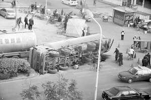 昨天上午,记者再次来到黄河路与五一路交叉口处,看到出事的槽罐车仍然横躺在黄河路慢车道上。槽罐车下“天坑”仍然张着黑口,过往车辆只能缓慢通过。事故现场尽管被市政部门用护栏围了起来,由于过往行人较多,现场险情不断。