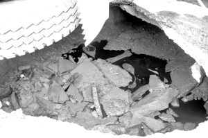 本报讯 11月29日,本报五版以《马路惊现“天坑”槽罐车“失足”》报道了一辆载满煤灰的槽罐车行驶到周口市区黄河路与五一路交叉口时,路面突然塌陷出现“天坑”,槽罐车侧翻在地一事。如今,事情已经过去5天,槽罐车像“扎根”一样躺在慢车道上,“天坑”仍无人修补,险情犹在。市民纷纷来电质疑相关部门工作效率太低。
