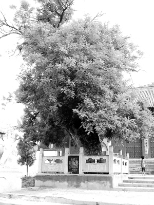 这棵千年古槐,相传为张志伯老人当年亲手所植,其意“植槐定宝地”。虽历经千余年风霜雪雨、电光雷火,这棵古槐依然倔强峥嵘、枝虬叶繁,势如盘龙卧虎、丹凤朝阳,春风中绿叶沙沙,仿佛是一位饱经历史沧桑的老人,在向人们娓娓诉说这里的昨天、笑谈这里的今天、憧憬这里的明天。
