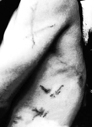 陕西丹凤县一村民方某被雷击后,左胳膊和左腰部出现了多处血红图案,既像“文身“,又像“象形字”,令在场人费解。