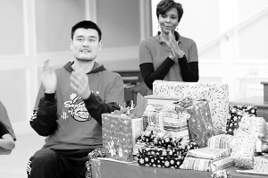 昨天,火箭队球员来到当地的一个社区活动中心,为这个社区的18个家庭分发圣诞礼物。图为姚明准备为小朋友分发礼物。