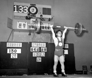1956年6月7日,中国运动员第一次打破世界纪录。中国人民解放军最轻量级举重运动员陈镜开在上海参加解放军和上海市举重队同苏联队举行的一场比赛中,以133公斤的成绩,打破了美国运动员温奇1955年创造的最轻量级挺举132.5公斤的世界纪录。新华社发