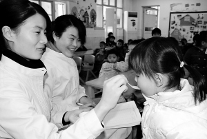 昨日,市疾控中心工作人员在为市直幼儿园的小朋友喂服脊髓灰质炎“糖丸”疫苗。为营造一个全社会关心儿童免疫接种的良好氛围,我市实行强化免疫,有效预防脊髓灰质炎发生,确保儿童身心健康。记者 李寒 摄