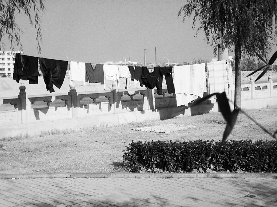 风景秀丽的周口滨河公园是市民休闲健身的好去处,可是近日小记者发现,有人图自己方便,将家里的衣被拿到那里晾晒,破坏了本来的好景致,市民对此颇有意见。晚报小记者 王文博 摄