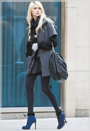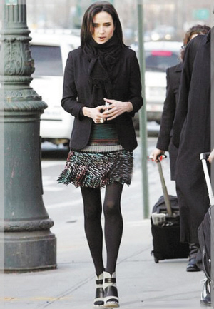 珍妮弗·康奈利当然不用再寒冬穿凉鞋上街,但是你可以像珍妮弗·康奈利这样西服上装搭配深色雪纺蛋糕裙,显得年轻很多呢。