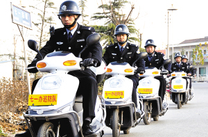 昨天,川汇区七一路办事处巡防队员骑着崭新的电动自行车在七一路上巡逻。当日上午,该办事处为巡防队增添了装备——电动自行车,以提高快速反应能力,对辖区重点路段、居民区开展全天候巡逻工作。晚报记者 朱海龙 摄