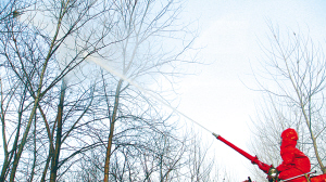 由于蜂窝位置较高,且在树梢上,给摘除工作带来很大困难。经过缜密考虑,指挥员委派一名经验丰富的战斗员穿上防蜂服,站在水罐消防车车顶,使用水炮将其射落(大图)。在高压水炮的冲击下,马蜂窝瞬间被击碎并一块块掉落到地上。其余的战斗员迅速将蜂窝碎块装入编织袋中,随后进行掩埋处理。