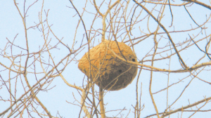 12月10日15时45分,接到村民请求捣毁马蜂窝的报警电话后,鹿邑县消防大队指挥员汪清明带领6名战斗员迅速赶赴现场。经过现场查看,消防官兵发现该马蜂窝呈椭圆形,直径约有半米(小图),高挂在村内一棵距地约20米的杨树枝上。