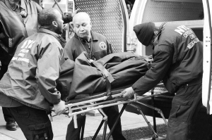 调查人员和验尸官随后赶到这间公寓,鉴定死者死因,展开相关调查(上图)。