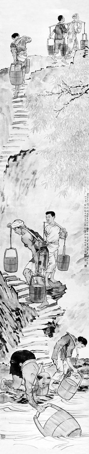 高300厘米,宽却仅有62厘米。徐悲鸿1937年流落重庆,映入其眼帘的第一道风景线即是一行行挑水的汉子,他们那吃力的步履和被水桶压弯的扁担,使徐悲鸿深刻地感受到那份生活的艰辛和生活在这块土地的重庆人世代相传的抗争精神。