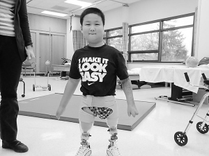 在遥远的大洋彼岸,接受了美国医生的第一次手术——秦明河安装了假肢,终于站立起来啦!据悉,明年春天小明河将再接受一次大的手术,即植皮和内脏手术,这是小明河与死神抗争的关键手术,相信小明河会顺利渡过这一难关。通讯员 胡洪涛 供图