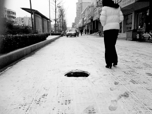 12月14日上午8时许,一位行人小心翼翼地从一个无盖窨井旁走过。