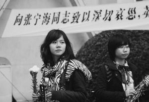 14日中午11时,上海复旦大学本部、南区、北区的食堂前拉起了“向张宁海同志致以深切哀思,英雄一路走好”横幅,同学们陆续向13日凌晨在营救到黄山户外运动的复旦学生牺牲的黄山民警张宁海献花祈福。