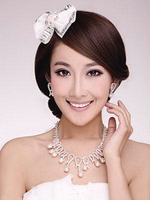富有金属光洁质地的蝴蝶结头饰,让新娘造型平添了几分活泼的快乐特质,让新婚的喜悦在空气中弥漫。