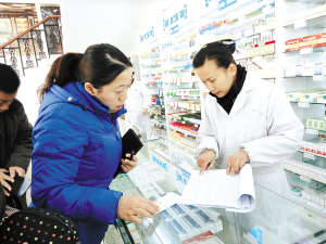 21日上午,市发改委工作人员到周口市区部分药店和医院检查药品降价执行情况。图为市发改委工作人员正在一药店进行检查。晚报记者 程文琰 摄