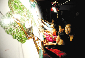 12月21日,沈阳市望湖路小学的学生与工作人员一起表演皮影戏。