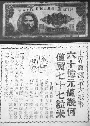据专家介绍,这种纸币是新疆在极度通货膨胀的情况下发行的,发行时间最多半年,刚面世不久就已经销声匿迹,正规的研究刊物也极少会注意到。