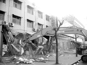 当日9时许,执法队伍进入现场,并在附近拉起警戒线。一辆大型挖掘机开始强行拆除一违法建筑(如图)。记者看到,该违法建筑为活动板房,是用来经营网吧生意的,占据了大半个人行道,与两边整齐的门面房格格不入。拆除完这处违法建筑后,执法人员又走向人行道上的另一处违建熟食店……