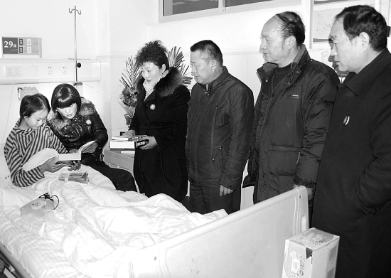 不久前,鹿邑县西城中学八年级学生完颜秀敏不幸患上了血癌,为给女儿治病,其父母借遍了亲戚邻居,家中债台高筑。了解到这一情况后,元旦前夕,鹿邑县人大、县妇联有关负责人与河南贵臣置业公司员工一起赶到商丘市人民医院,看望慰问了血癌女孩完颜秀敏,并给她送去了1万元捐款及课外读物、营养品等“新年礼物”,祝福她早日康复,重返校园。 晚报记者 侯国防
