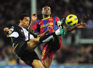 1月2日,巴塞罗那队球员阿比达尔(右)与莱万特队球员巴尔多拼抢。当日,在西班牙足球甲级联赛第17轮比赛中,巴塞罗那队主场以2比1战胜莱万特队。新华社发