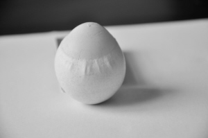 当日, 记者在王先生家见到了这枚状似“不倒翁”的怪蛋:直径大约3厘米,下半部蛋壳颜色为正常的白色,上半部蛋壳则为深黄色,且半透明,整枚蛋从远处看既像一尊弥勒佛,又像一个不倒翁。