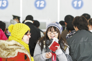 1月11日,经过5个小时的排队等候,在上海读书的卢婷婷(右)终于买到了开往家乡济南的车票。对于无数在沪打工者、学生和探亲客而言,能顺利登上返乡的列车回家过年,是寒冷的冬季里最简单而温暖的心愿。 新华社发