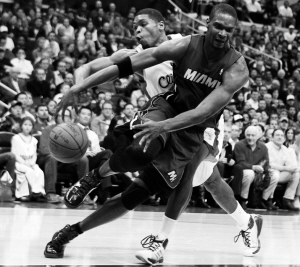 1月12日,热火队球员波什(右)带球进攻。当日,在NBA常规赛中,迈阿密热火队以105比111不敌洛杉矶快船队。新华社发