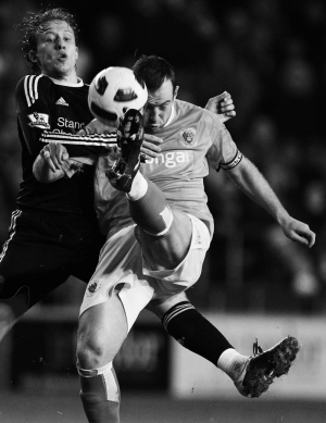 1月12日,利物浦队球员卢卡斯(左)与布莱克浦队球员亚当拼抢。当日,在英格兰足球超级联赛第19轮的一场补赛中,利物浦队客场以1比2不敌布莱克浦队。新华社发