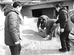 该局执法人员突击检查这个废旧洗浴中心时,发现院内搭建有6间土房,地上堆放着重达8吨的散水泥,工人们正在用铁锨向包装袋内分装水泥。经清点,土房内存有已包装好的假冒伪劣水泥155袋,空包装袋6条。