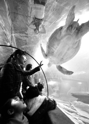 2月7日,游客在观赏海洋动物。当日是农历大年初五,武汉东湖海洋世界馆游客增多。新华社发