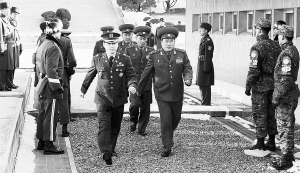 2月9日,朝鲜人民军大校李先权(前右)在一名韩国军官(左)的引导下率领朝鲜代表团到达板门店会谈场所,准备参加韩国与朝鲜的军事预备会谈。