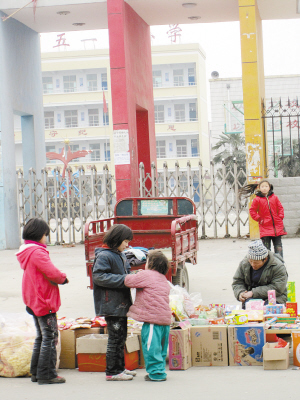 记者从多所中小学校门口的传达室值班人员处了解到,过了农历正月十六,学校开学以后,每天上学和放学时间,流动商贩们就会出现在学校门口,向孩子们兜售各种零食小吃。