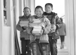 2月19日,山西运城万荣县荣河镇金井村金井小学五年级学生喜领免费发放的教科书。当日,山西运城万荣县荣河镇金井村金井小学学生高兴地领到了国家免费提供的新学期教科书。从2006年全面落实国家“两免一补”政策以来,山西农村中小学生的家庭经济负担减轻,一些贫困家庭辍学儿童重回课堂。新华社发
