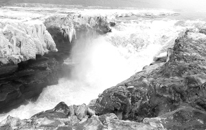 近日,受气温回暖影响,位于山西省吉县和陕西省宜川县交界处的黄河壶口瀑布冰消河开,河岸厚厚的冰层与奔腾咆哮的河水形成这个季节壶口特有的美景。这是2月19日拍摄的黄河壶口瀑布。新华社发