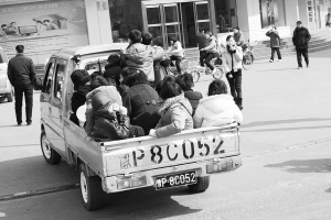 本报讯 昨天12时许,在周口市区七一路与中州大道交叉口,交警拦住了一辆载了16人的小型货车(左图)。