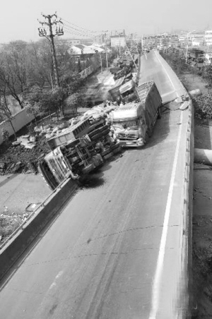 2月21日拍摄的坍塌事故现场。当日凌晨,浙江省上虞市境内的春晖立交桥发生引桥坍塌,坍塌总长度120米,最高落差7米。事故造成引桥上4辆货车侧翻,3人轻微伤,事故具体原因正在调查之中。新华社发