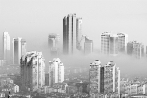2月21日,山东省烟台市的城市建筑在平流雾笼罩中若隐若现。当日,全国多地遭遇雾天,中央气象台发布大雾黄色预警。