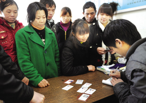 浙江省义乌某企业老职工带来的新员工正在办理报名登记手续(2月16日摄)。