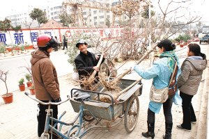 一位花贩介绍,过了农历正月十五,花贩们就陆续来此兜售花果树苗了,他们经营的主要是从周边县区运过来的枣树、梨树、杏树、樱桃树、山楂树、石榴树、葡萄树、桂花、海棠、腊梅、木香花、红玉兰等价格实惠、易成活的品种。