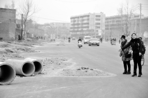 跟随记者到此的赵先生的妻子哭着说:“就是这个土堆(如图),把我丈夫摔成了现在这样儿,你看,那儿还留有一大片血迹呢!”她不明白宽宽的马路上为啥会有这么多土堆,为啥土堆旁不设置明显的警示标志?