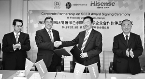 2月15日,联合国环境署与海信集团代表在肯尼亚首都内罗毕的联合国环境署总部正式签署合作协议,海信由此成为联合国环境署绿色创新奖未来3年的全球首家合作伙伴,也是中国企业首次跻身联合国环境署绿色创新行列。