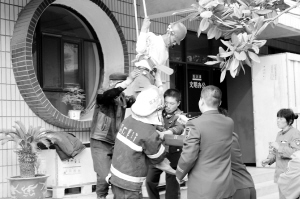 2月24日15时许,周口市区七一路与汉阳路交叉口附近某两层居民楼发生施工吊架倒塌事故,致使一名施工人员腿部受伤被困楼顶。川汇区消防官兵接警后迅速赶赴事发现场,给受伤工人系上安全腰带和安全绳,将其安全救下(右图)并送往医院。