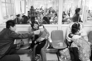 图为家长坐在输液室外的条凳上陪孩子输液,他们需要交纳3元的输液椅费用。 新华社发