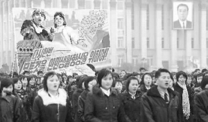 2月27日,朝鲜平壤,金日成社会主义青年同盟组织朝鲜青年上街游行,呼吁保护国家政权。