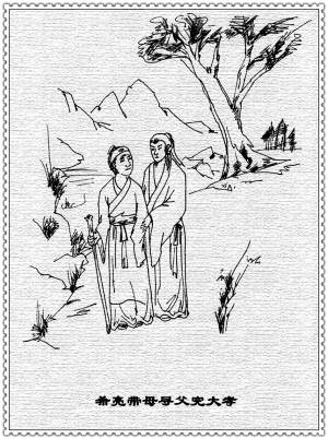 终于趁着混乱之际,希亮拉着母亲逃了出来。在逃难的路上,希亮体贴母亲年纪大,买来甘美食物孝敬母亲,自己吃些野菜野果充饥;赶路途中,更是嘘寒问暖,小心谨慎照顾母亲。白天,母亲在灼人的太阳下,走路艰难,希亮就背着母亲,一步一步地往前走。鞋子走破了,脚板磨出了水泡,砂石一硌痛入心肝,希亮从不抱怨一声。