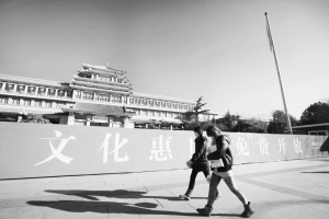3月2日,两名女士从中国美术馆“文化惠民 免费开放”的标语前走过。当日,位于北京市东城区五四大街的中国美术馆正式向公众免费开放。新华社发