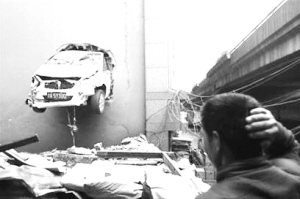 3月1日9时许,重庆渝中区长滨路南滨大厦发生一起离奇车祸,一辆轿车在室内停车场行驶时失控,撞破停车场厚厚一层墙壁,半截车身悬在室外七八米高空,幸运的是,车上人员无大碍。重晚 摄