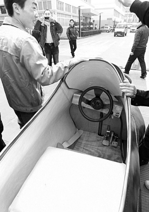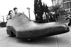 3月4日,一辆由手工缝制牛皮做外壳的鞋形电动车在浙江省温州市一家大型鞋厂亮相。这只“鞋车”长3米,高1.05米,可乘坐两人,最高时速30公里,充满电可行驶400公里。中新 摄