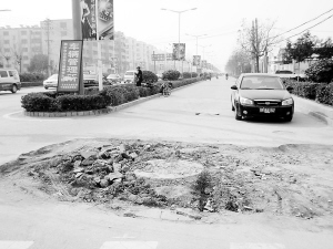 记者看到,这个路口人流量很大,路人行至路坑前都得绕着走。附近居民梁先生告诉记者,这个路坑是城管部门年前修管道时挖开的,可能还没有修好,所以没有回填。据梁先生回忆,大约10天前,有辆汽车转弯时一头扎到了这个路坑里,几个人帮忙推也没推出来,最后还是拖车给拖出来的。