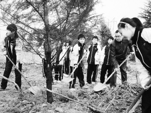 3月9日上午,几名中学生在老师的带领下参加植树活动。